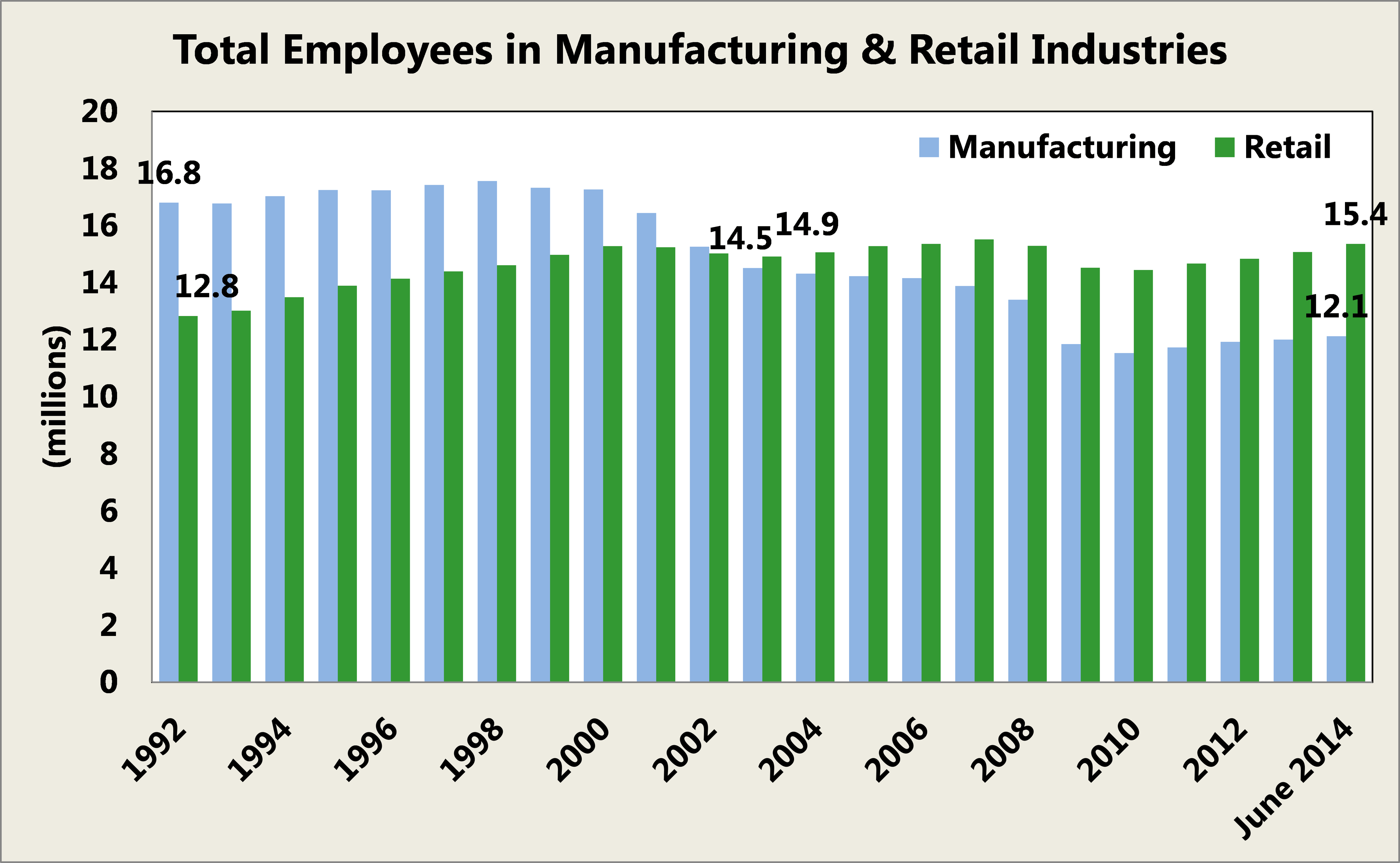 The focus of the American economy is navigating away from manufacturing and more towards retail and services. As you can see in the chart below, in 1992, there were nearly 4 million more individuals who worked in manufacturing than in retail. But the two industries swapped places in 2003, and the gap has only continued to widen each year, with there now being more than 3 million more individuals working in retail versus manufacturing.