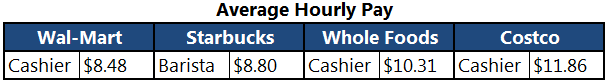 While it may come as no surprise that individuals working at Whole Foods (WFM +0.00%) and Costco (COST 1.42%) make significantly more than those at Wal-Mart -- 40% in the case of Costco -- it likely comes as a surprise an individual at Starbucks (SBUX 2.35%) will earn only 5% more.