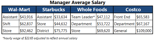 It's important to note the charts above only show the pay offered by the retailers and doesn't reflect other benefits -- like the College Achievement Plan offered by Starbucks -- but it's interesting to see that management positions at Wal-Mart may be more lucative than similar position at more highly thought of retailers.