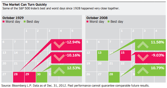 Consider this, investment management company Invesco noted that $1,000 invested into the S&P 500 at the end of 1927 would be worth $8.1 million by 2012. But if you missed just the 10 best days over that period -- which spanned more than 20,000 trading days -- your return would stand at $2.6 million. Put differently, by missing just 0.05% of the days, you'd end up with 67% less money.