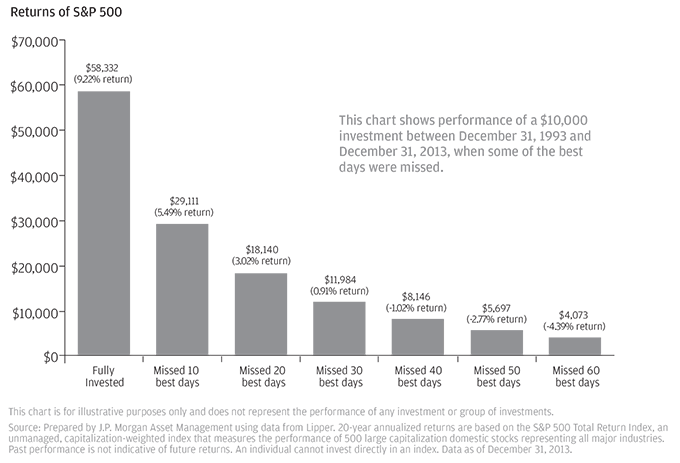 $10,000 invested at the end of 1993 would be worth nearly $60,000 by 2013. Yet missing the 10 best days would cut the value of the investment by half: