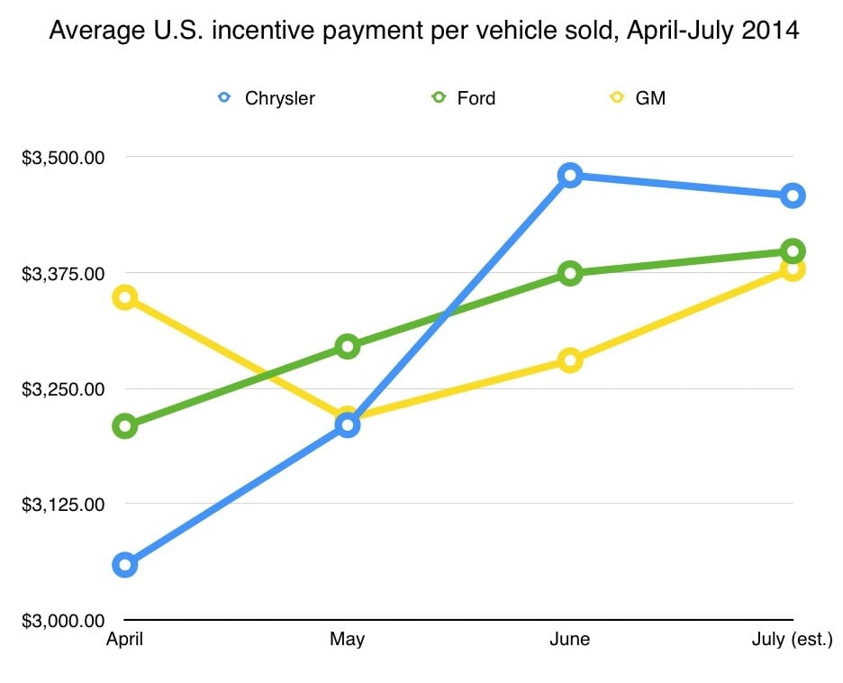 But profits haven't been great, because Chrysler has been winning those sales (and others) with big incentives. According to data from TrueCar, Chrysler's average incentive payout has risen past those of its Detroit rivals over the last few months. (The three Detroit automakers tend to pay higher average incentives than other manufacturers because of their big sales of full-size pickups. Big payouts are typical in that market segment, where the average payment often exceeds $4,000 -- but despite the payouts, pickups are among Detroit's most profitable products.)
