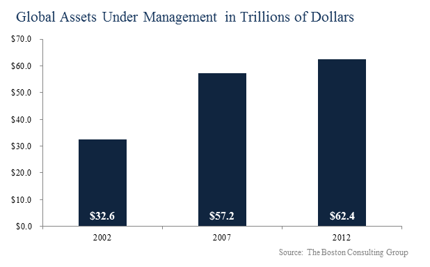 The size and scope of the asset management industry has grown on the back of growing world wealth. From 2002 to 2012, managed assets nearly doubled, from $32.6 trillion to $62.4 trillion.