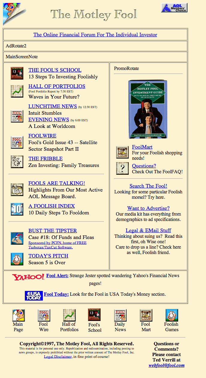 The FoolPort had some cool innovations. In the most un-Wall-Street-like way, we announced every pick we made ahead of time, allowing our viewers to "front run" us if they wanted to; we didn't buy until at least 24 hours later. We were trying to disrupt the financial world and its tendency to take action first and let the public know later. We're still doing that, with services like Motley Fool One and Supernova always giving members a full day first to pick up any new recommendation we make and will later act on. We also supported every stock with its own discussion board; we know, no big deal today. But back then all kinds of skepticism were heaped on "chatter" in "chat rooms" in "cyberspace" and The Motley Fool was made to sound like we were stretching the outer limits of the investment galaxy with this bleeding edge commitment to community intelligence.