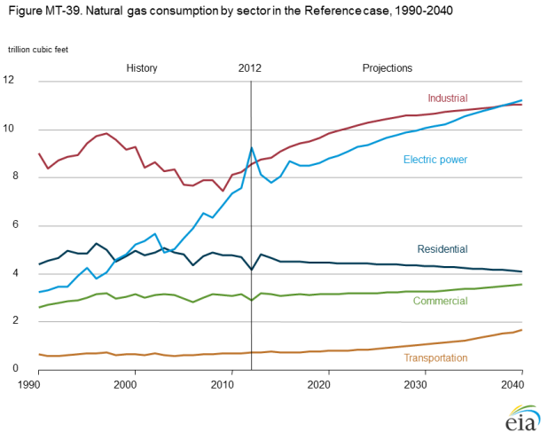 However, with the discovery of an economical method to extract the abundant amount of gas found in shale, it's opening up the door for additional uses of natural gas in the country. As the following chart demonstrates, the use of natural gas for industrial and electric power will drive much of the industry in the future.
