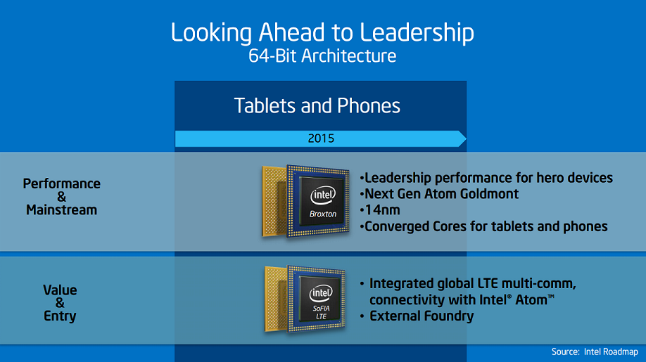 SoFIA, the low-end play, will apparently be built on the same 28-nanometer foundry processes used for its competition in that segment. Intel won't have a clear advantage with SoFIA, but it will have a competitive product that eventually transitions to a leadership position in early 2016 as the company moves this product to its 14-nanometer manufacturing technology (giving it a technology lead).
