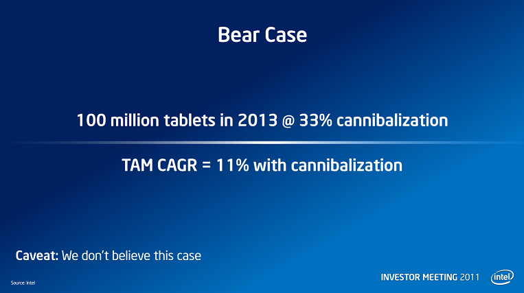 Intel, bluntly speaking, didn't expect that the tablet market would eat into PC sales as it did. Even its "bear case" scenario that the company outlined at its 2011 analyst day turned out to be too optimistic. Furthermore, once the chip giant understood the situation, it initially tried to fight the trend by making PCs more "tablet-like" rather than directly participating in the tablet craze.