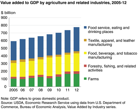 Agriculture and related industries contributed $775 billion to the U.S. economy, and about $4 trillion globally, according to the most recent data from the U.S. Department of Agriculture. Farms, forestry, fishing, and related activities accounted for about $200 billion, while manufacturing and serving food, beverage, and clothing accounted for the rest of the industry.
