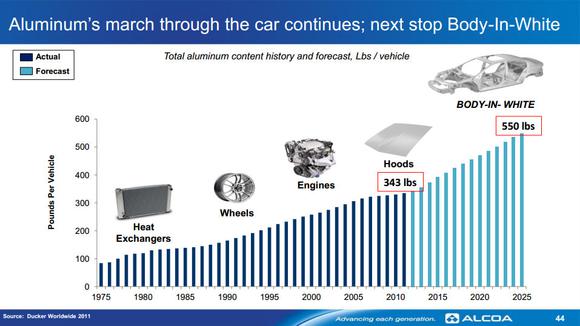 Because of this the automotive industry is a particularly compelling growth area for aluminum. Each year the auto industry uses more aluminum in each car and as the following slide notes its usage is expected to grow from 343 pounds currently in the average car to 550 pounds per car over the next decade.