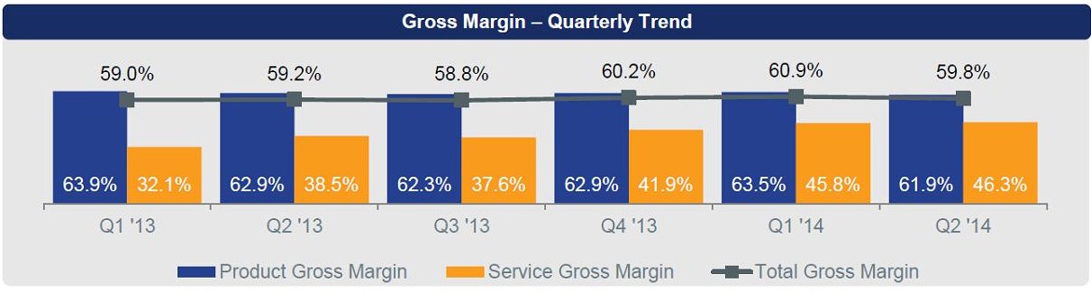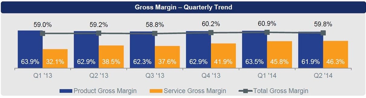The following chart nicely shows what's happening. Stratasys adjusted gross margin in its product division decreased 1% from the year-ago period, to 61.9%. However, the adjusted gross margin increase in the service division more than made up for the product division's decrease, as it increased to 46.3% from 38.5%. It should be interesting to see how the service gross margin is affected by the two service bureau acqusitions. We might get some idea of that in Q3; however, because the acquisitions just closed in Q3, it won't be until Q4 that we'll get a clearer picture.