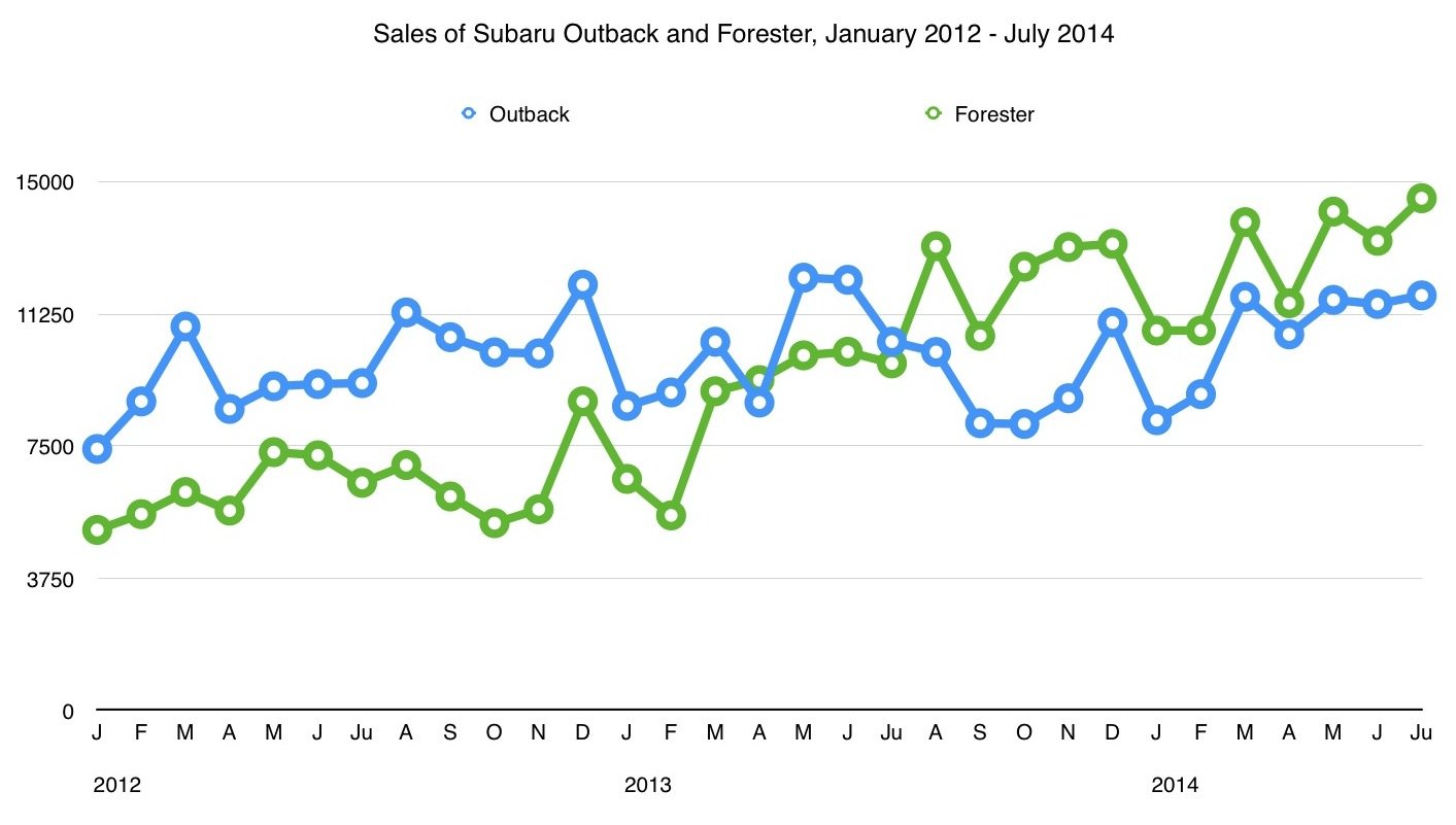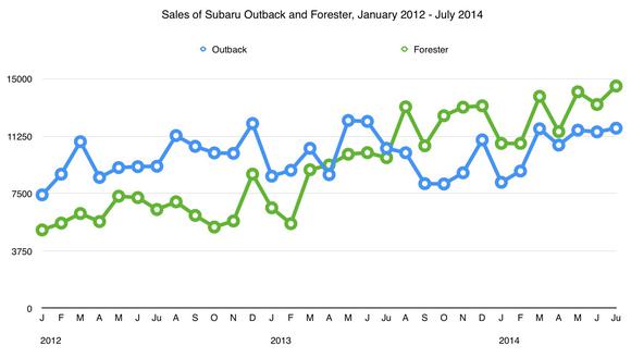 Forester sales long trailed those of the Outback, but as you can see, as the all-new Forester started arriving at dealers in the first half of 2013, sales surged.