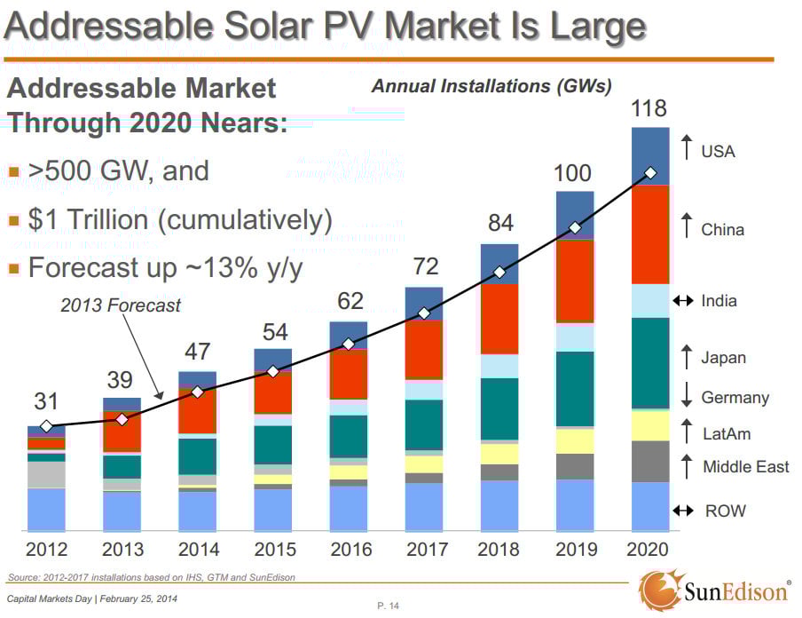 The addressable solar market is expected to grow about 13% annually through the end of the decade. Furthermore, it represents a $1 trillion in cumulative capital. That's a lot of money, especially when considering that even after its run over the past two years, SunEdison's stock value is just over $5 billion. That suggests the future of the company's stock could be brighter than investors think, as just a tiny sliver of those sales would move the needle.