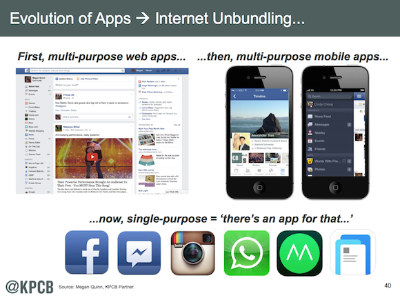 As Facebook (FB +0.97%) CEO Mark Zuckerberg told The New York Times in April, "In mobile there's a big premium on creating single-purpose first-class experiences." In no uncertain terms, Zuckerberg laid out a strategy for "unbundling the big blue app" into distinct single-purpose apps. That's why it shouldn't have been much of a surprise when the company said last month that it would force users to download a separate Messenger app, unbundling that functionality from the core Facebook app.