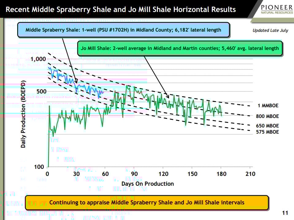 In addition to that, Pioneer Natural Resources is also appraising results from the Middle Spraberry Shale and Jo Mill intervals. While the results of both intervals have been mixed, the company is seeing its best wells produce really strong EURs. In the Jo Mill the two best wells look to produce an EUR of 800,000 BOE, while the best Middle Spraberry Shale well looks like it's on pace to produce 700,000 BOE, as noted in the following side.