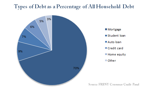 The Federal Reserve Bank of New York keeps a running tally of existing loans in the U.S. Financial System. As of its latest report, mortgages made up the majority of all loans outstanding. Student loans were second, and auto loans were third.