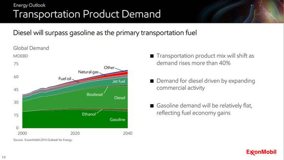 However, demand for the petroleum industry's products is expected to grow elsewhere in the world. Global demand for transportation fuel is projected to grow by 40% through 2040. Demand for diesel is expected to outpace demand for gasoline, as the following chart illustrates.