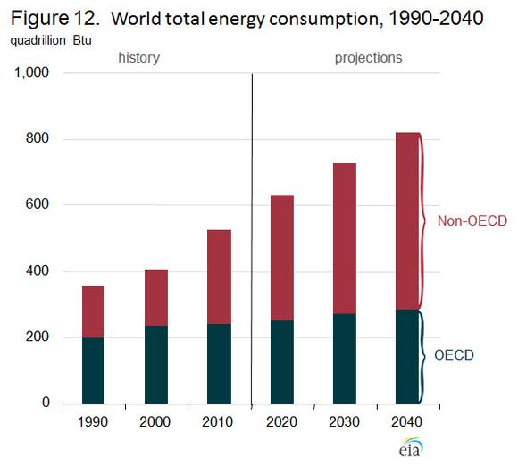Investors, analysts, and media outlets have given loads of attention to how the rise in alternative fuels and improving fuel efficiency will drastically reduce the need for oil in the long term. While the concept makes sense, it is missing one key element: the advancement of the developing world. According to BP's statistical review of world energy, 2013 was the first year ever in which oil consumption from non-Organization for Economic Cooperation and Development nations surpassed that of OECD nations. According to projections from the U.S. Energy Information Administration, energy demand from these states is expected to double between now and 2030.