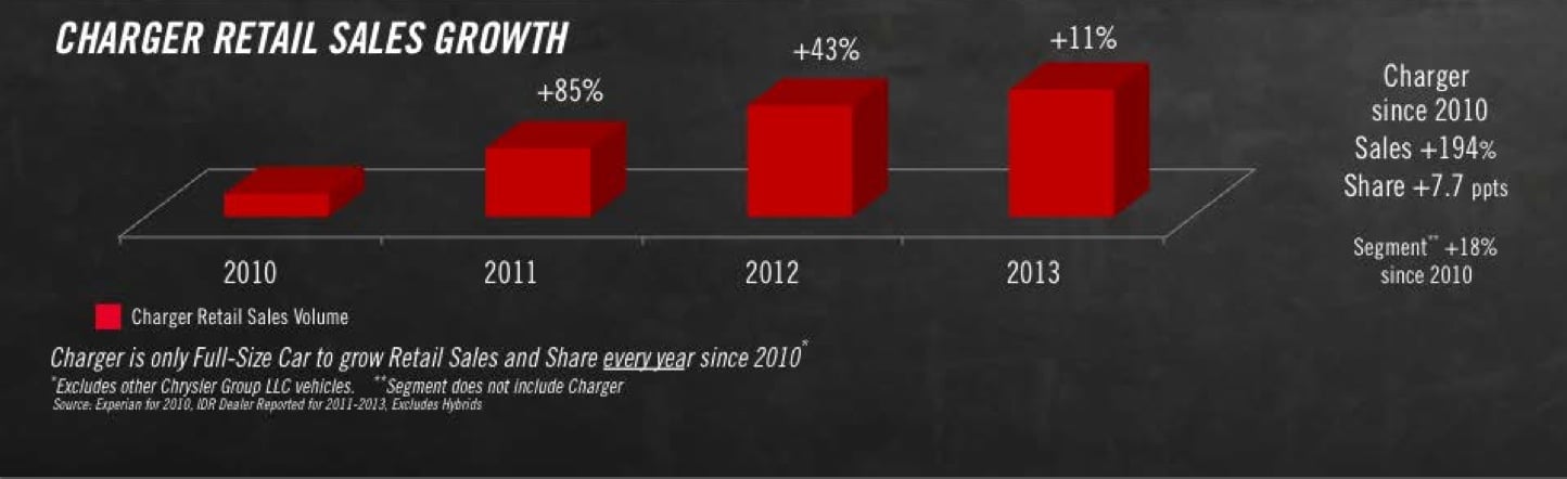 And sales have been growing, as Chrysler's ongoing incremental improvements to its big sedans have won the attention of more and more buyers. Retail sales of the Charger grew 194% from 2010 through 2013, Kuniskis noted in a presentation in May, compared to 18% growth for the overall full-sized sedan segment.