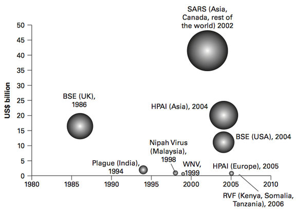 The World Bank crunched the numbers, and according to its calculations, emerging zoonotic diseases like Ebola have economic costs that have ranged from $500 million to $50 billion in the past. The 1998 Nipah Virus epidemic in Malaysia, for example, cost $671 million in lost productivity and disease control, it says. That decade's outbreak of Plague in India was likely three times as expensive, while SARS cost almost $50 billion in 2003.