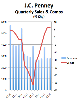 Penney reported net sales of $2.8 billion, a 5% increase above the $2.66 billion in the year-ago period, as comps increased 6%, and improvements were made in clearing out its clearance items. Where once it had to give away the store to get people to come in, the retailer has apparently been able to become a little more selective.