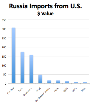 Pork exports are even less than poultry, and though they more than doubled by June from $16 million last year, the industry has suffered from bans before due to issues with the use of ractopine, a drug used to fatten up hogs and cows before slaughter. In fact, the total value of U.S. food and agricultural exports was only $1.3 billion in 2013, or less than 1% of all farm exports.