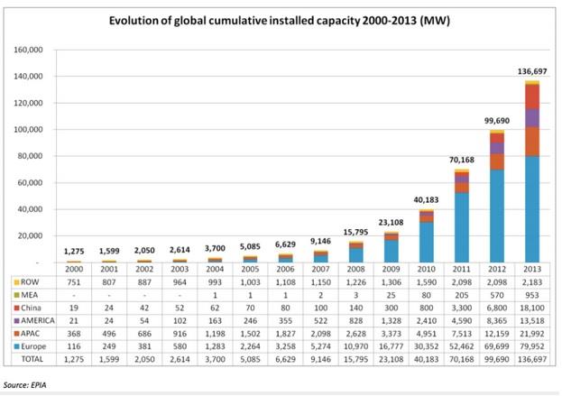 China has installed 3.3 GW of new solar in the last six months, marking a 100% increase over the same period last year. To keep the momentum going, the government has announced its goal of 13 GW in 2014. To put that goal into perspective, it would mean adding 1.7 GW per month for the rest of the year, which is nearly as much solar capacity as exists in the U.K. It would also be more new solar capacity in just one year than total solar capacity of the United States, a nation that has grown its own solar capacity by a stunning 418% since 2010.