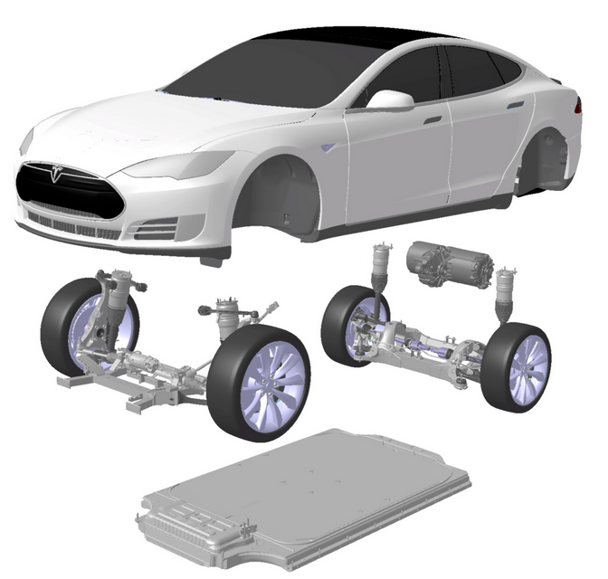 The Model S drive unit sits above the rear axel. The battery stretches the floor of the vehicle. Image source: Tesla Motors.