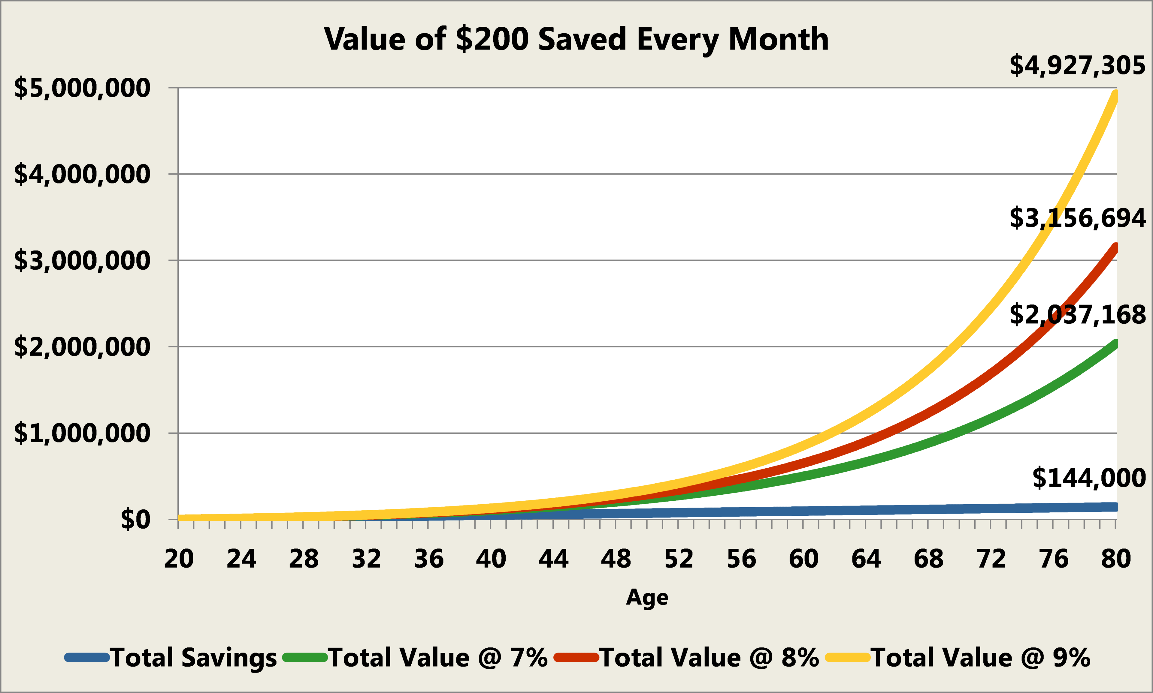 The chart is showing what $200 put into an S&P 500 index fund through a retirement account each and every month beginning at age 20 and stopping at age 80 would be worth after decades and decades of patient saving and investing. Of course we can't project what the future returns will be, but you can see the remarkable growth even at a very conservative 7% annual interest rate.