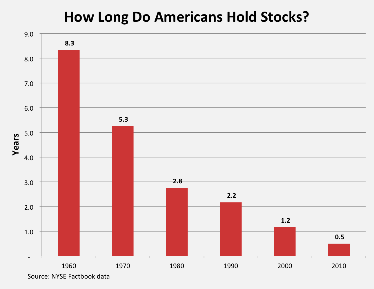 From 1960 to 2010, the average holding period for owners of NYSE-listed stocks shrunk from 8.3 years to a mere six months. Here's what that looks like in a simple bar chart: