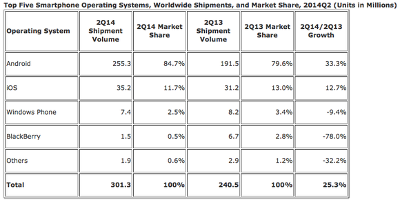Again, look at the data. No one matches up with Google (GOOGL 0.07%)(GOOG +0.00%) in this market. Android vs. Windows, iOS, BlackBerry ... they're all losing share, and in Q2, only Apple shipped more devices year-over-year: