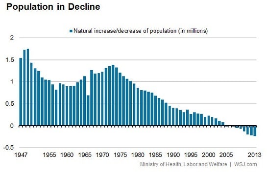 Japan made headlines in 2013 when the country's population dropped by almost 250,000. According to BBC Asia, if the trend were to continue Japan would lose a third of its population over the next 50 years. Also, at roughly 30%, Japan has one of the highest percentage of individuals 65 and older in the world -- and that number is growing.