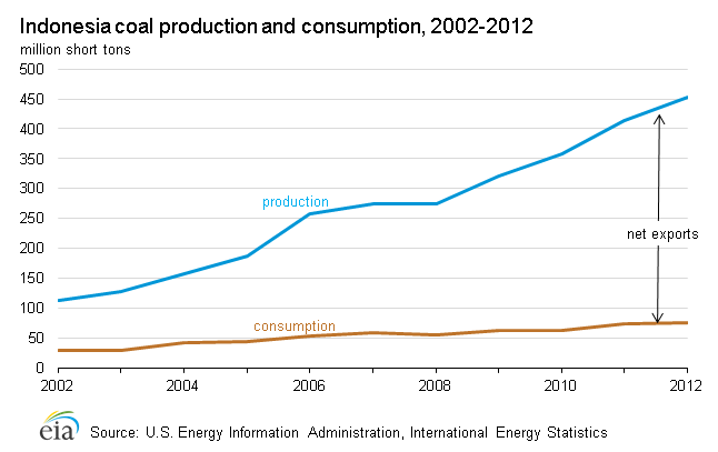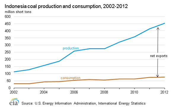 For example, between 2002 and 2012, Indonesia increased its coal production from roughly 100 million tons a year to around 450 million tons. The country's consumption, meanwhile, started that span at under 50 million tons. By 2012, Indonesian consumption was still well below 100 million tons annually. The difference between production and consumption is exported.