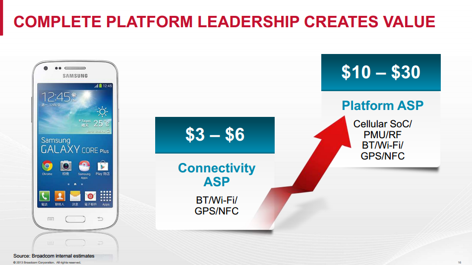 In fact, Broadcom's management -- when it still intended to go after this market -- emphasized how important having the complete platform was in order to be a viable supplier to the low end of the mobile market. Driving this point home is the following statement from CFO Eric Brandt at a Morgan Stanley conference: