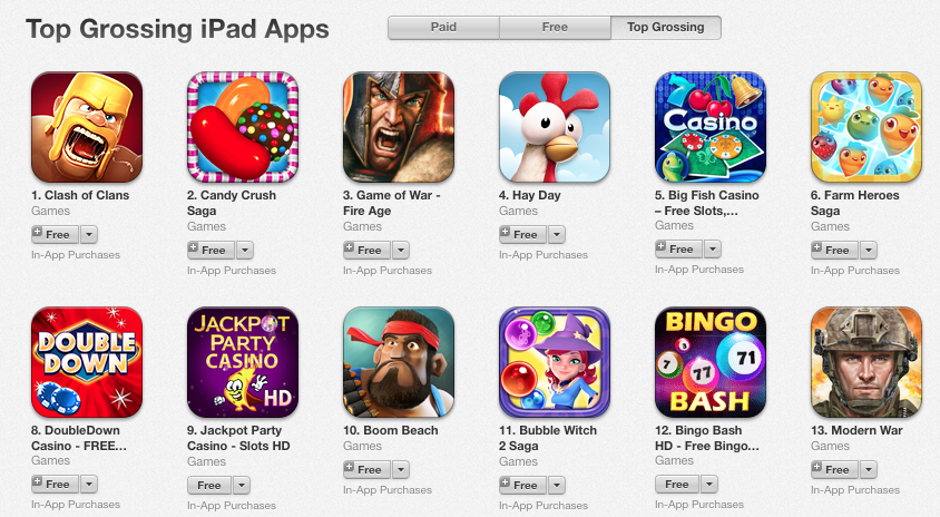 A screenshot of the top-grossing iPad games as of Aug. 15, 2014. Source: Apple iTunes App Store.