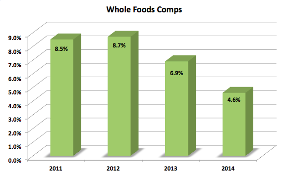 On the whole, any large grocer that is able to grow comps faster than inflation is considered a success. For years, Whole Foods was posting numbers far higher, and the stock responded with similar rises. Lately, however, those numbers have been coming in lower, causing Wall Street to worry about saturation, and the effects of competition.