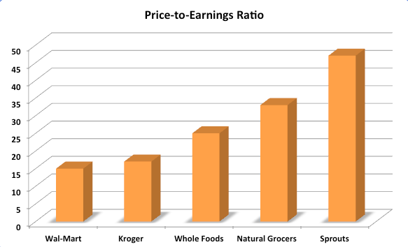 As you can see, Wal-Mart and Kroger are much lower-priced, but their heady growth days are still ahead. And Sprouts and Natural Grocers have much higher price tags, but they also have smaller footprints than Whole Foods, which means there's more potential room to grow.
