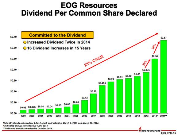 EOG has grown its oil production substantially over the past few years. However, the company hasn't forgotten its shareholders. It boosted its dividend by 33% in February and then by 34% this month, illustrating the company's focus on returning a growing portion of its cash flow to investors.