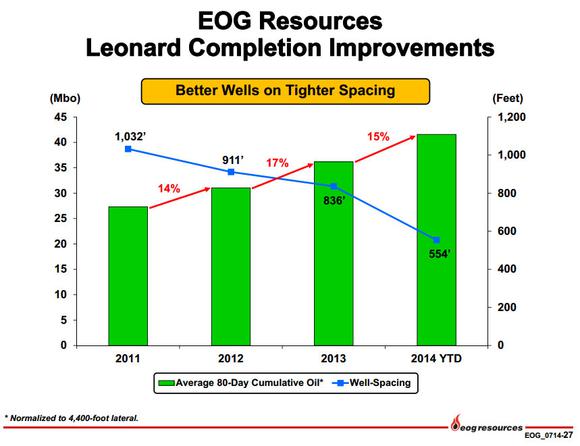 EOG Resources is finding ways to get even more oil from its existing assets by testing new zones, as well as improving techniques that enable it to drill wells closer together. As the following slide shows, it has nearly cut the spacing of its Leonard shale wells in half, while also enjoying improved oil production.