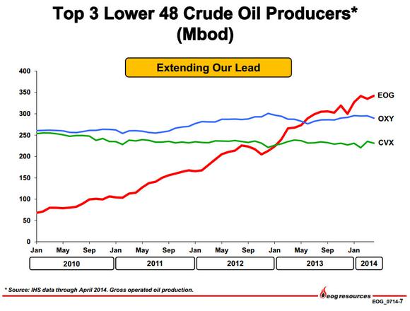 Second, EOG is a growth leader and it's organic. EOG's estimated 2014 oil growth on a barrel per day basis is greater than any other company in the peer group and this growth is all organic. We have the assets and the inventory depth to sustain this growth. ... Growing oil as we did 33% in the Lower 48 this quarter is a remarkable achievement.