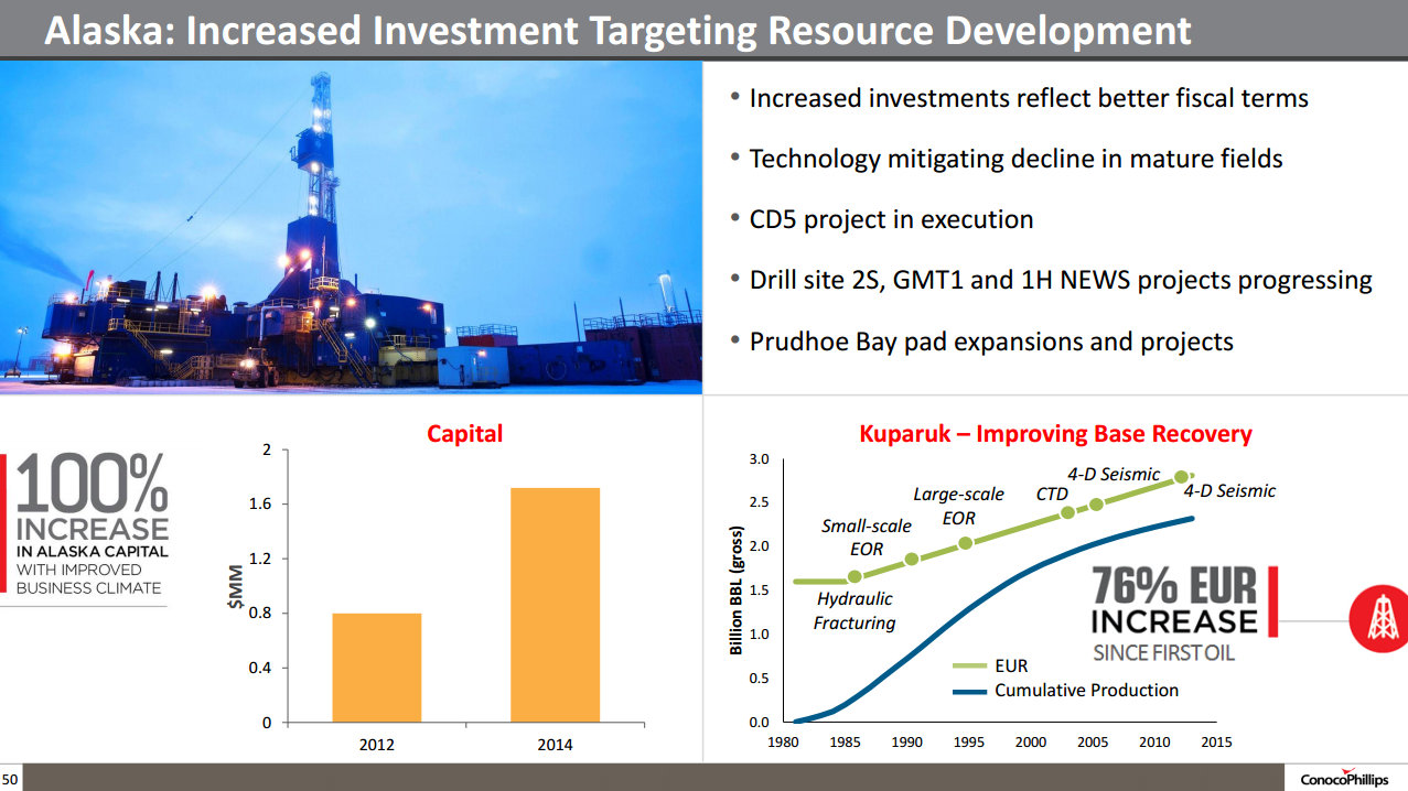 This additional capital has enabled ConocoPhillips to add two rigs to its Kuparuk field in the North Slope. However, the company isn't stopping there as it is investing to build another drill site for a third rig in the Kuparuk River Field. Further, it's planning the Greater Mosses Tooth #1 development in the National Petroleum Reserve and the 1H Northeast West Sak, or NEWS, development. These three additional projects represent capital investments of upwards of $2 billion and would add 47,000 barrels of oil production per day by 2017 to the state if approved. That's a big boost considering that statewide production is down to around 500,000 barrels of oil production per day.