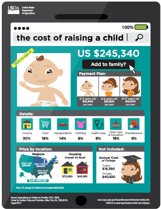 At least, that's what a recent USDA report says about the costs of raising a child. Specifically, if you're a middle-income, two-parent family, the average cost to raise a child born in 2013 will reach $245,340.