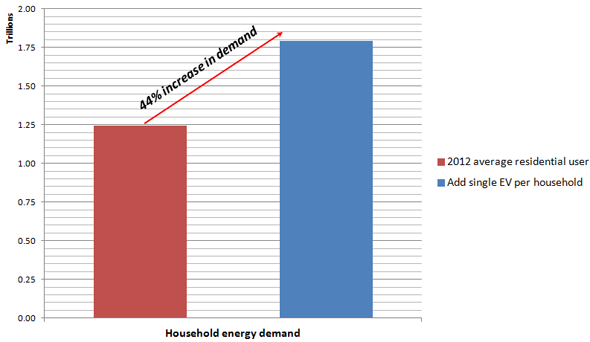 But what's the impact of that 4,800 kWh on power usage? According to the U.S. Energy Information Administration, the average residential customer consumed just over 10,800 kWh in 2012, so we are talking about increasing power use by a whopping 44% per home, per electric vehicle. There are more than 115 million households in the country. Here's what power consumption -- just for residential customers -- would look like based on an EV in every driveway: