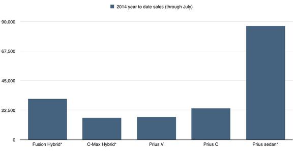 Ford's hybrids sell pretty well, but the Prius sells a lot better. Over the last few years, Toyota has expanded the Prius into a family of three models, but the original Prius sedan is still the top seller.