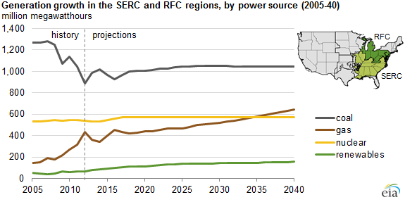 The EIA prepared three graphics that detail the projected rise of natural gas power generation in key power regions over the next few decades. The following chart takes a look at the Eastern region of the country.