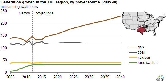 The EIA projects that natural gas will extend its lead in Texas as the dominant power source as it sees natural gas power generation surging by 81 million megawatt hours from 2012 to 2040, which is the fourth largest increase in the U.S. Like the East, this surge is due to the growth in power demand, which will almost be completely satisfied by new natural gas power generation. Meanwhile, the EIA is forecasting little to no growth in power generation from coal, nuclear, or renewables over the next few decades in Texas.