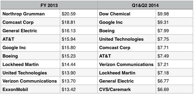 Through the first six months of this year, Dow Chemical has spent a whopping $9.98 million on lobbying activities. Here is a look at the top ten publicly traded spenders for the full year of 2013 compared to the first two quarters of this year: