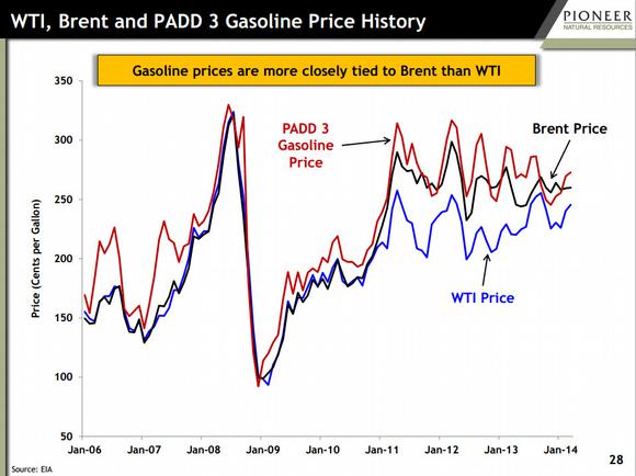 Pioneer Natural Resources and its fellow independent oil and gas peers are pushing for the U.S. to end its more than 40 year ban on oil exports. The reason it wants the export ban lifted is because the production of light crude oil in the U.S. is growing so fast that our refineries can't keep up. This is causing the price of domestically produced crude oil, which is commonly benchmarked to WTI, to trade at a discount to the globally benchmarked Brent crude oil. As the following slide shows, the two used to trade around the same price -- but as U.S. oil production surged it has caused WTI oil to trade at a discount.