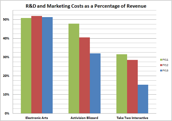 In 2013, EA spent almost $1.2 billion on research and development and content costs, compared to $858 million in development, licenses, and royalties for Activision Blizzard. Electronic Arts also spent almost $800 million on marketing and sales, while Activision Blizzard spent just over $600 million. Add these two segments up and you get a pretty significant chunk of sales: