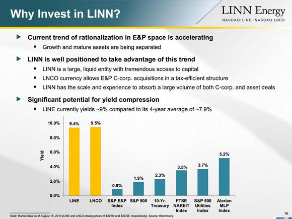 The last bullet point on the slide states that LINN Energy has "significant potential for yield compression," which CFO Kolja Rockov echoed on the company's conference call. This means that at the $31 unit price, investors buying today receive a yield at 9.4%. However, investors buying the company on the open market have historically only received a 7.9% yield, which would imply a nearly $37 unit price, or a 20% gain.