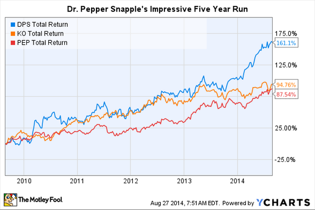 The company's stock has absolutely whipped its competition over the past five years. And even though Coke and Pepsi appear to have performed well, it's important to remember that the overall stock market returned 114% over the same time frame — meaning the industry's two biggest players are actually underperforming the market.